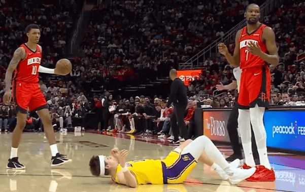 比赛第三节,里夫斯东契奇包夹KD,后者一把将里夫斯推倒,裁判回看后升级为一级恶意。