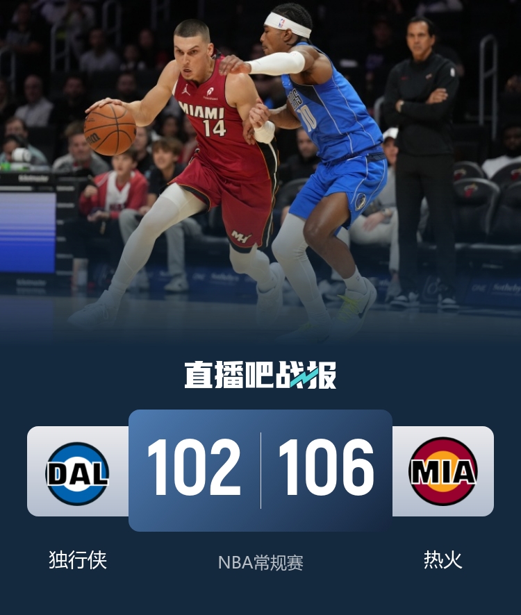 11月25日讯 NBA常规赛今日继续开打,热火坐镇主场迎战独行侠。热火近期收获4连胜并冲到东部第四位。