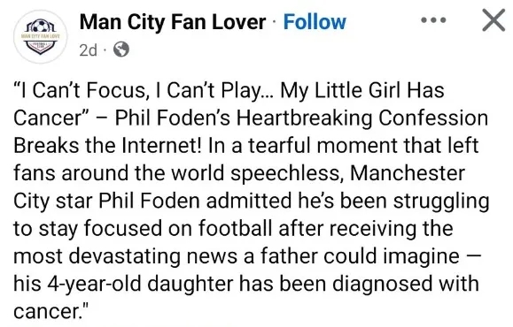 据悉第一条谣言出现在Facebook上,虚假地声称福登的大儿子、6岁的鲁尼已经离世。而一名网名为“曼城球迷爱好者”的造谣者还发帖,称福登4岁的女儿患有癌症。