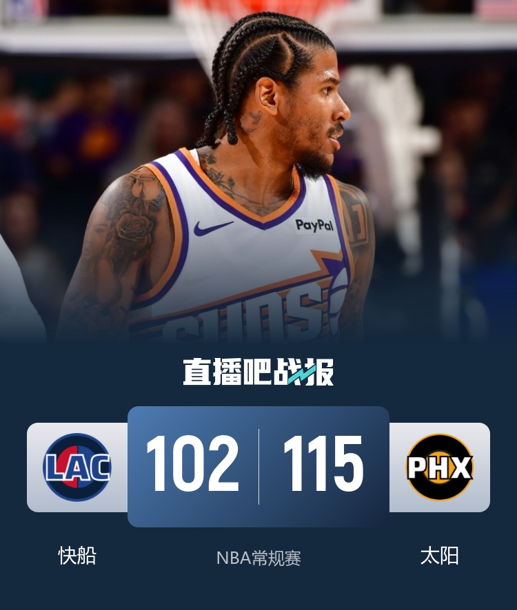 比赛开始,双方开场势均力敌,比分交替领先,快船持续冲击内线连投带罚拿分,太阳内外开花强势回应,次节太阳命中率下降,快船多点开花占据场上主动,布克和杰伦·格林相继命中三分奋力反击,比尔连续打铁失误,半场战罢快船51-48领先太阳。易边再战,快船突然哑火,太阳攻防两端压制对手,布克和杰伦·格林联手带队轰出28-8的进攻狂潮一举确立20分的领先优势,快船连造杀伤苦苦支撑,末节太阳延续火力,又是11-3的攻击波再度将分差拉开到20分以上,泰伦-卢换下主力投子认负。最终,太阳115-102击败快船,主场过关。