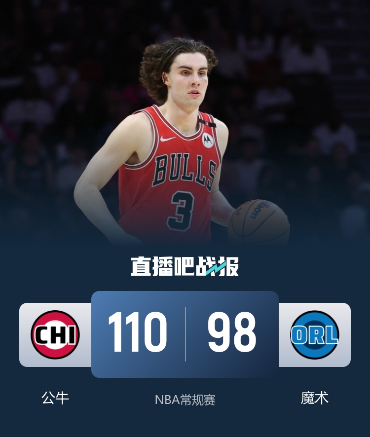 一开场,双方很快陷入缠斗,公牛内外开花,魔术连投带罚给出回应,班凯罗高效输出,公牛一波9-0还以颜色,次节公牛轮番冲击内线频频得手占据主动,班凯罗和瓦格纳联手拿分带队追赶,半场战罢公牛52-49领先魔术。下半场,公牛率先发力,吉迪和武切维奇先后三分穿针,公牛一举获得两位数优势,又是班凯罗挺身而出,连投带罚率队扳平比分,末节公牛占得先机,连中三分重获两位数领先,武切维奇助攻道苏姆飙中三分后自己两罚都有,魔术大势已去无力回天。最终,公牛110-98力克魔术,客场过关。