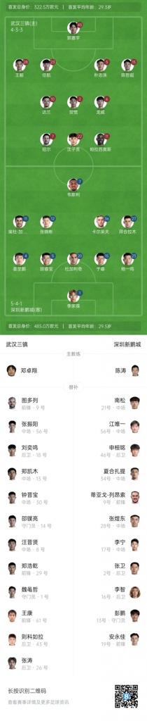 10月24日讯 中超第28轮,武汉三镇vs深圳新鹏城将于19:35开球,赛前首发阵容已经公布。